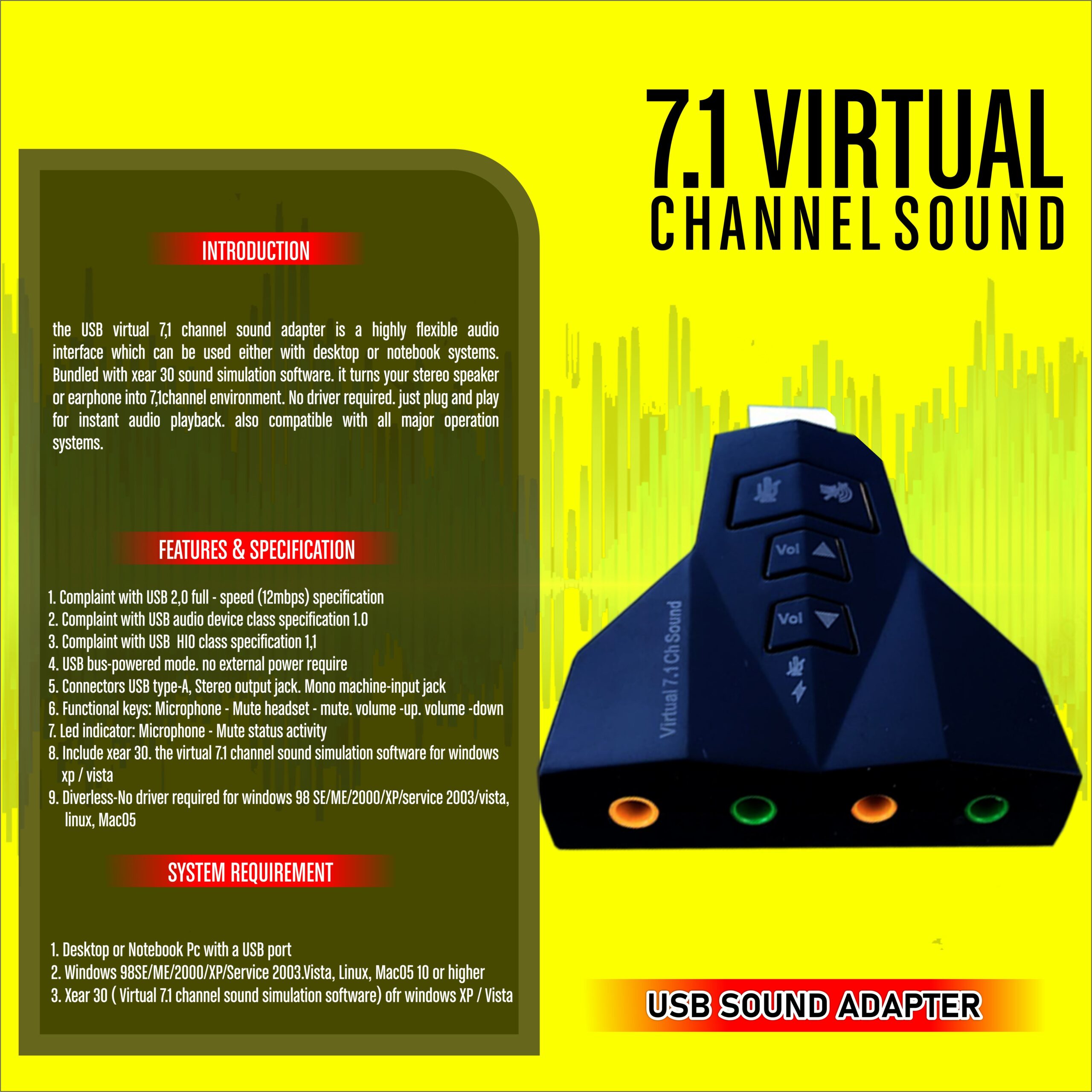 The USB Virtual 7.1 Sound Adapter is a highly flexible audio interface that can be used either with desktop or notebook systems. Bundled with Xear 3D Sound Simulation. It turns your stereo speaker or earphones into a 7.1 channel environment. No drivers required. Just plug and play for instant audio playback. Also compatible with all major operating systems.