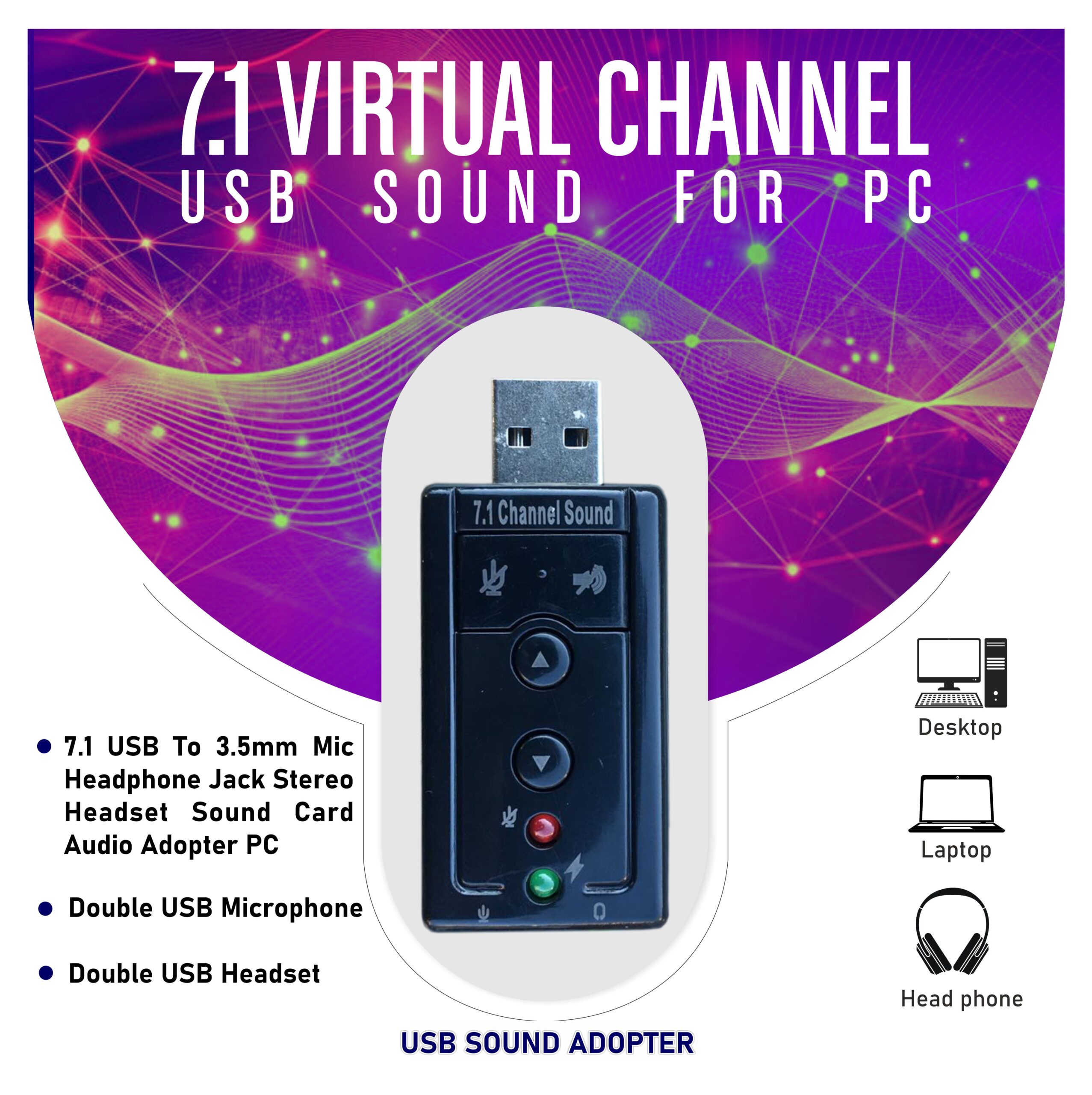 The USB Virtual 7.1 Sound Adapter is a highly flexible audio interface that can be used either with desktop or notebook systems.